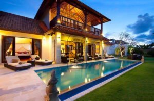The villa reflects a classic Balinese architectural style, with high ceilings, warm wooden finishes, and open spaces that allow natural light and airflow throughout the home. The large living area connects seamlessly to the outdoor space, creating a comfortable environment for everyday living.