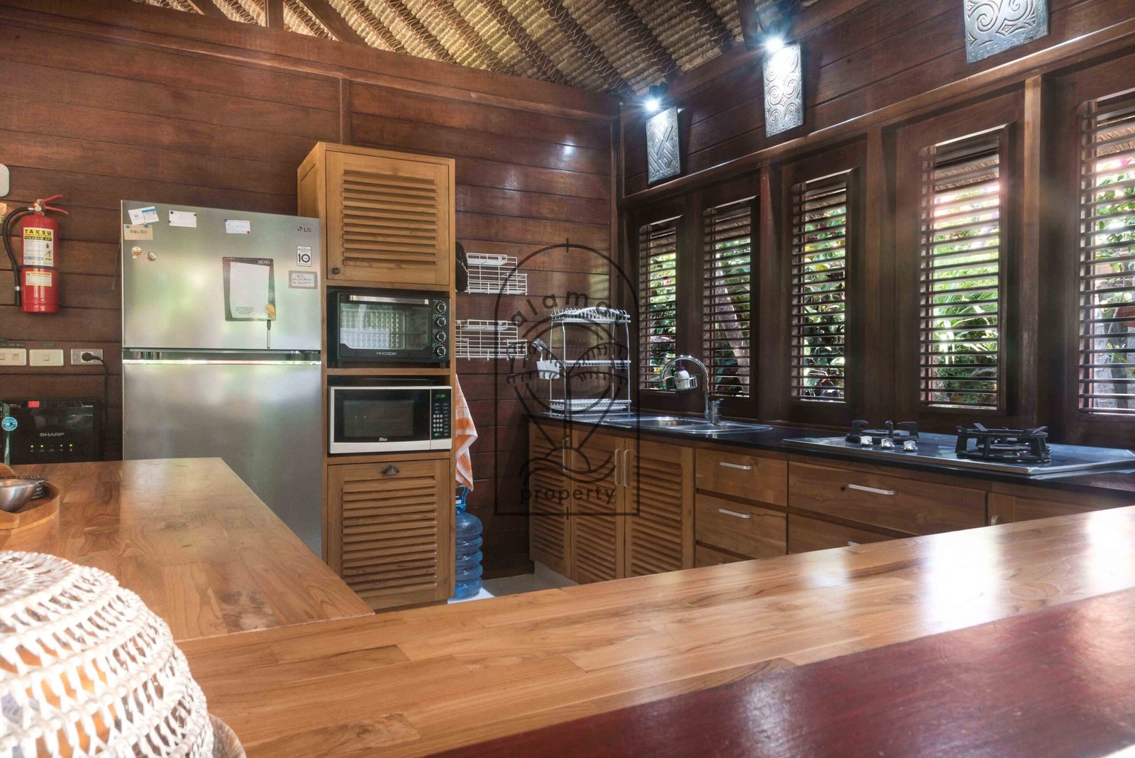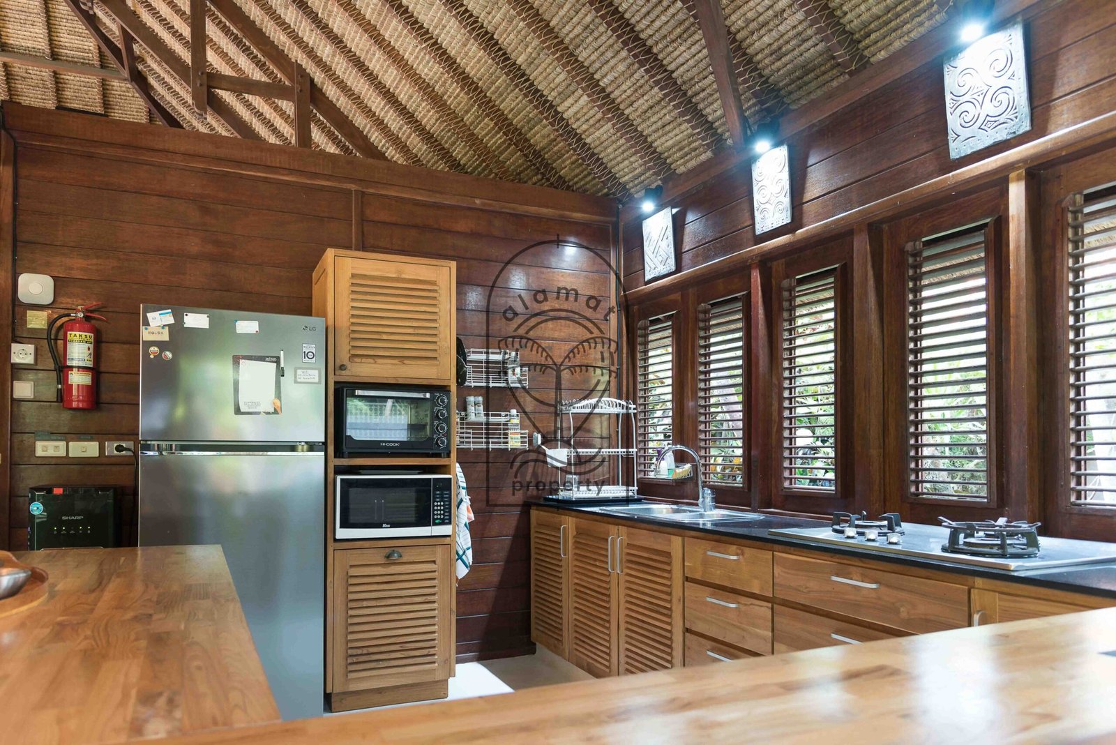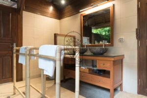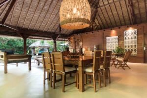 The fully equipped kitchen allows guests to prepare meals easily. In addition, the living area offers a cozy space to unwind after a day exploring Bali. The villa comes fully furnished and ready for daily rental stays.