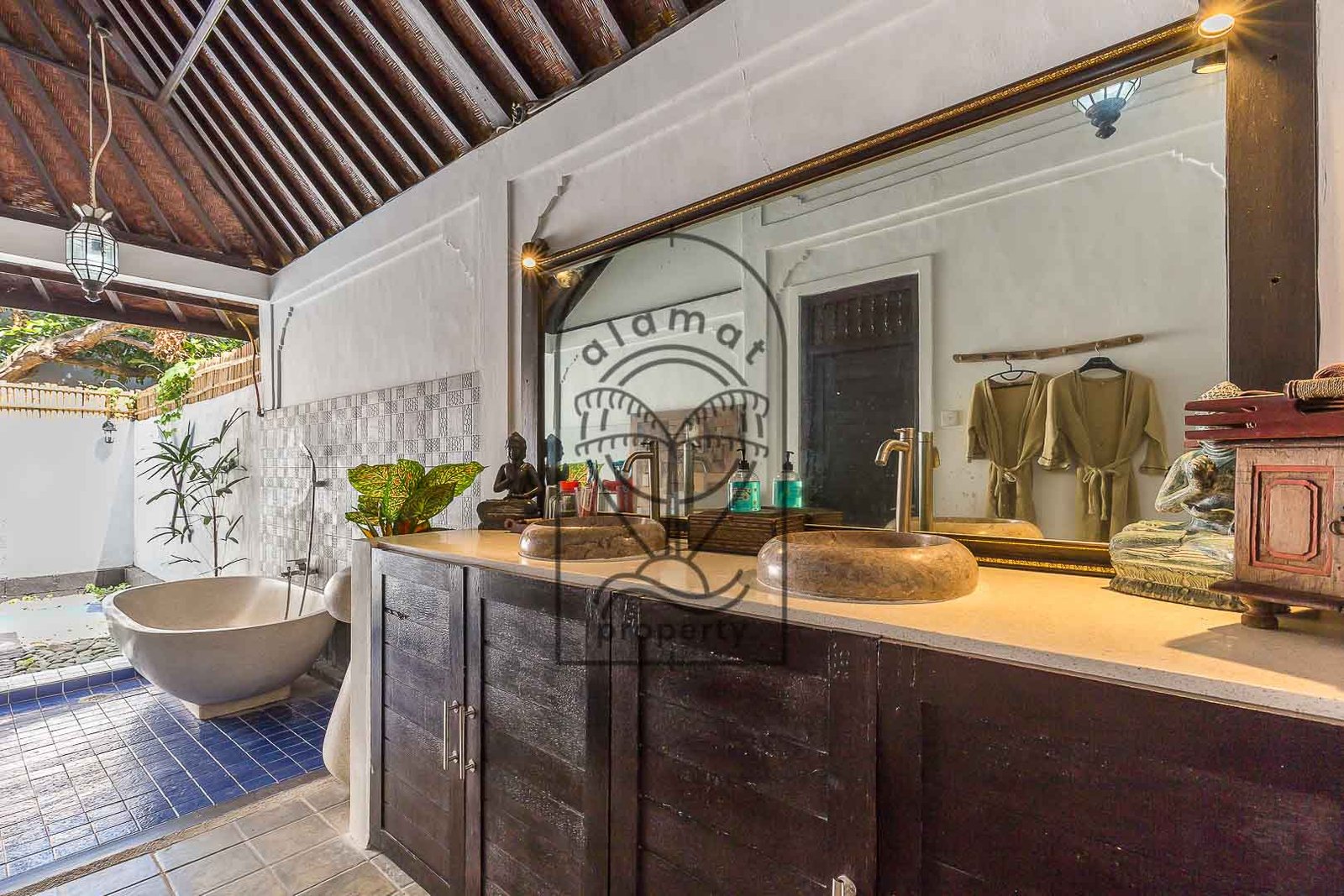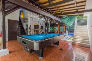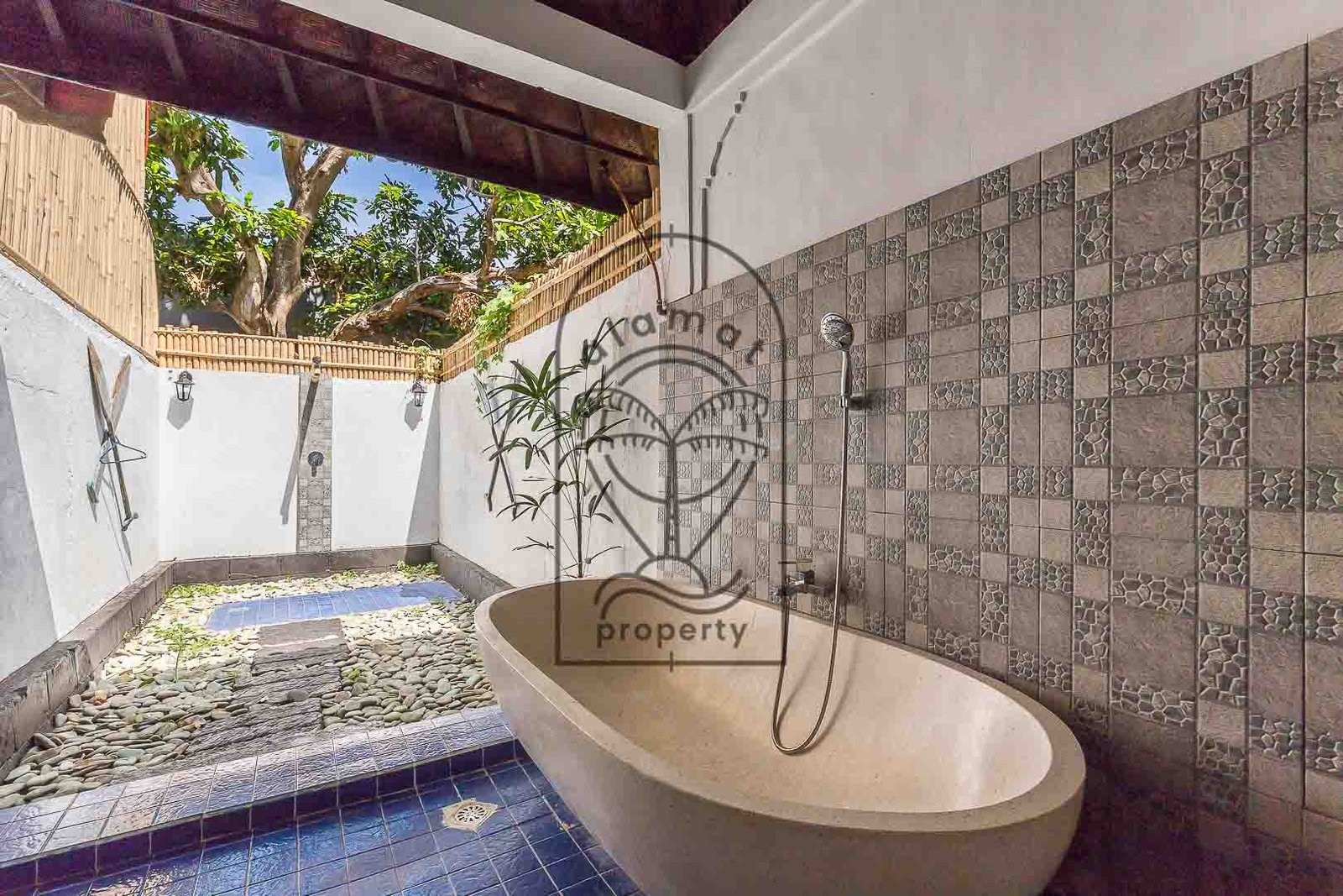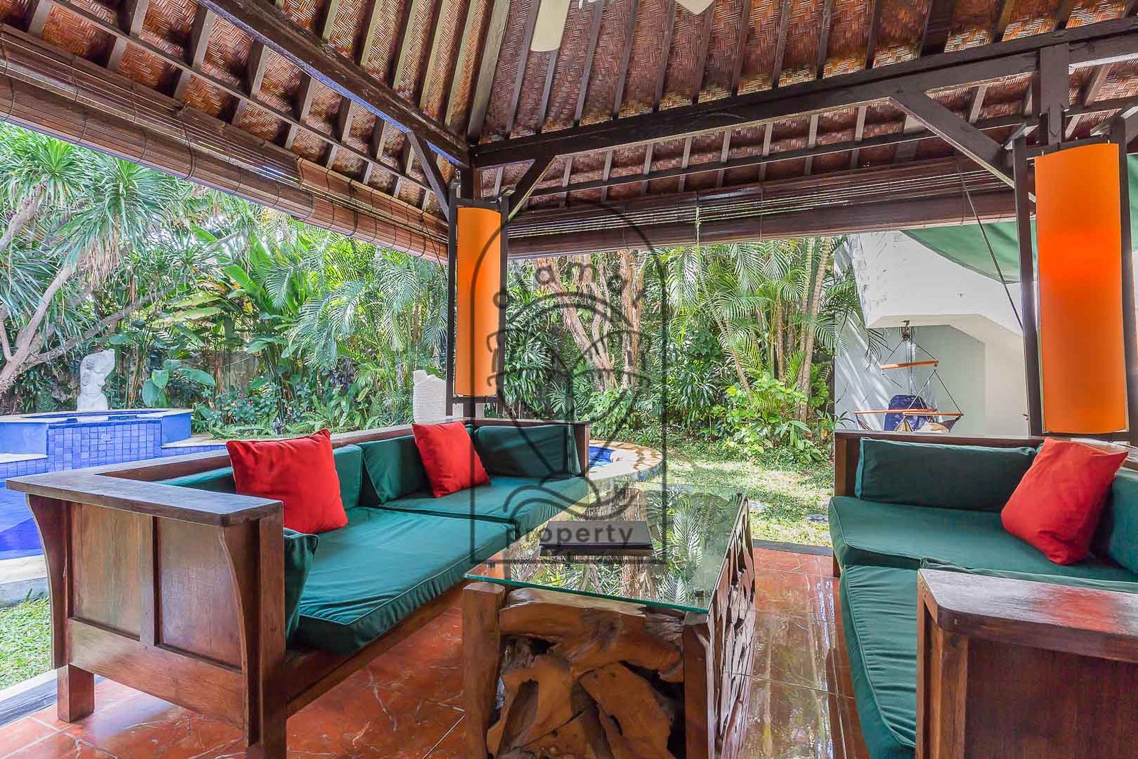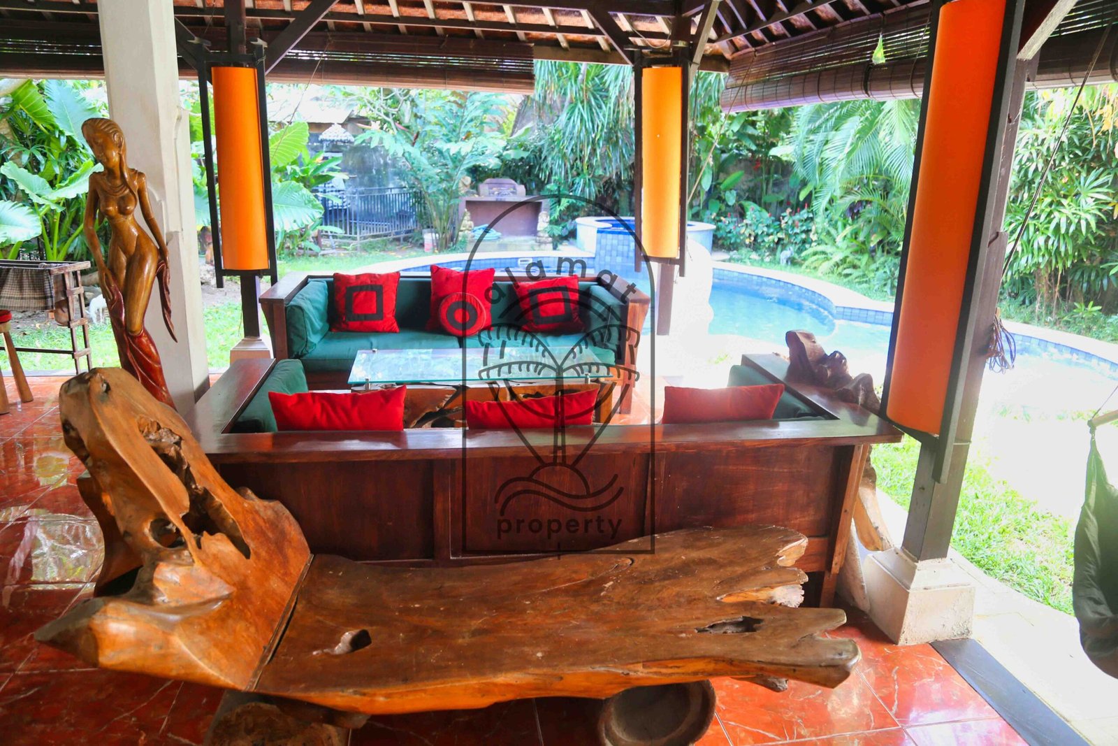 Set within a lush tropical garden, the villa features a peaceful outdoor environment with a private swimming pool and several relaxing areas. The design highlights traditional materials such as wood, natural stone, and handcrafted details, creating a warm and immersive atmosphere.